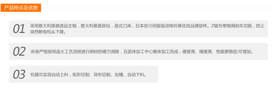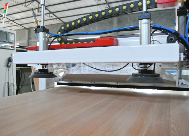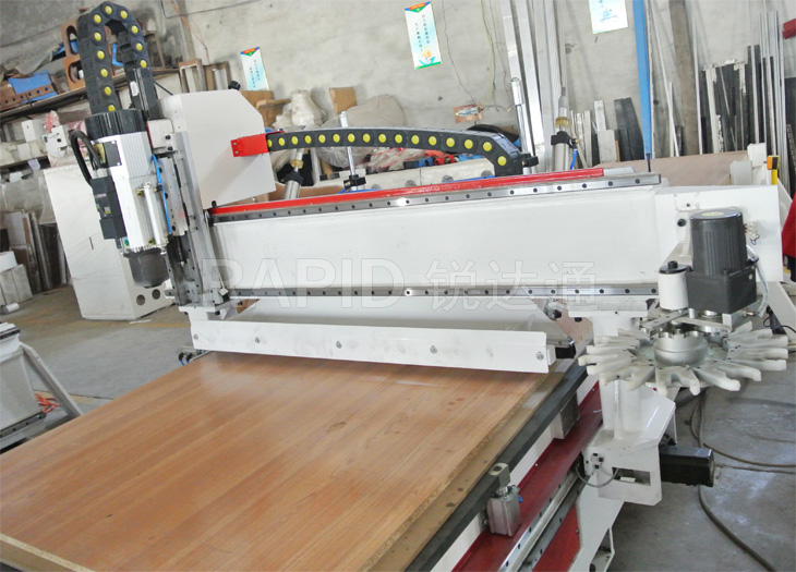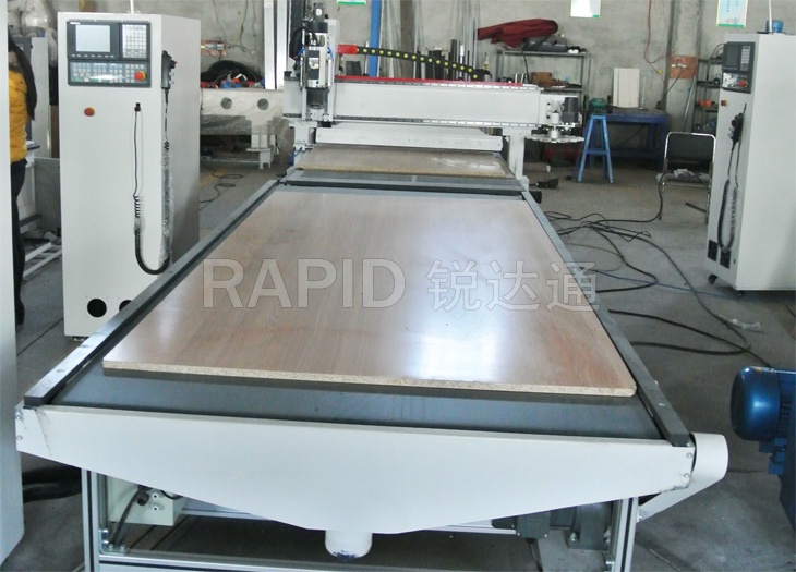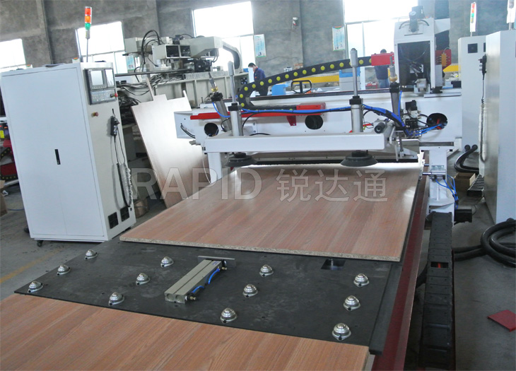 本款產品是全自動板式家具加工中心,本機可實現背板開槽,矩形切割,異形切割,實現上料,定位,開槽,開料,下料,自動貼標等功能。同時配有銳達通專用開料優化軟件,優化排版,減少板材浪費,真正提高生產效率。